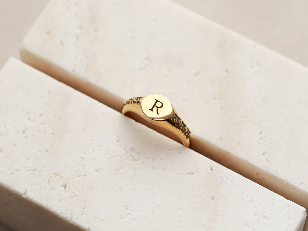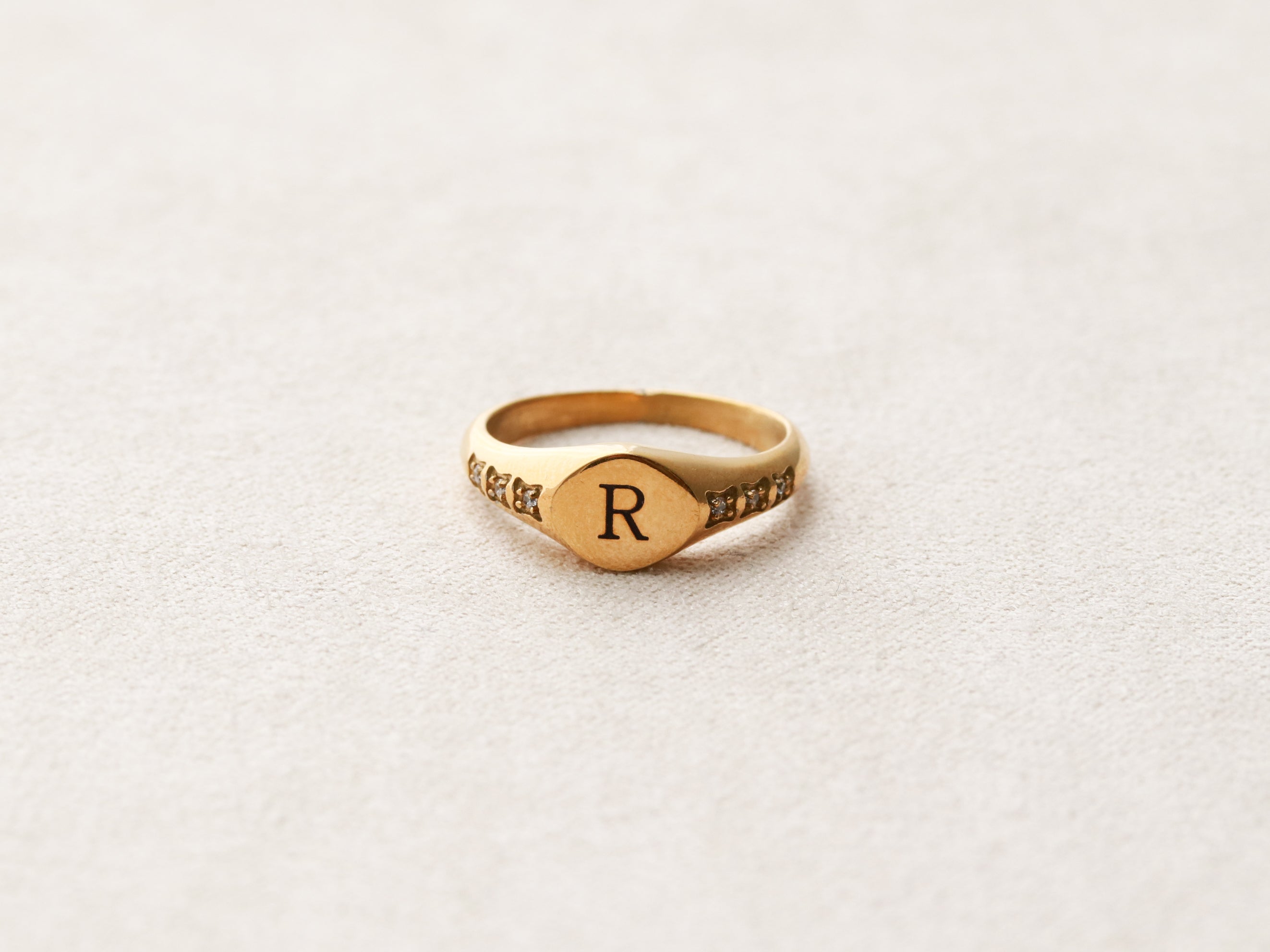 Our CZ Signet Rings are crafted from durable 18k gold-plated stainless steel with a glossy finish, accented by three cubic zirconia stones on each side of the personalized top. Personalize with a name, initial, birth flower, zodiac symbol, or special date. All of our rings are custom engraved in our studio and make perfect gifts for any special occasion.