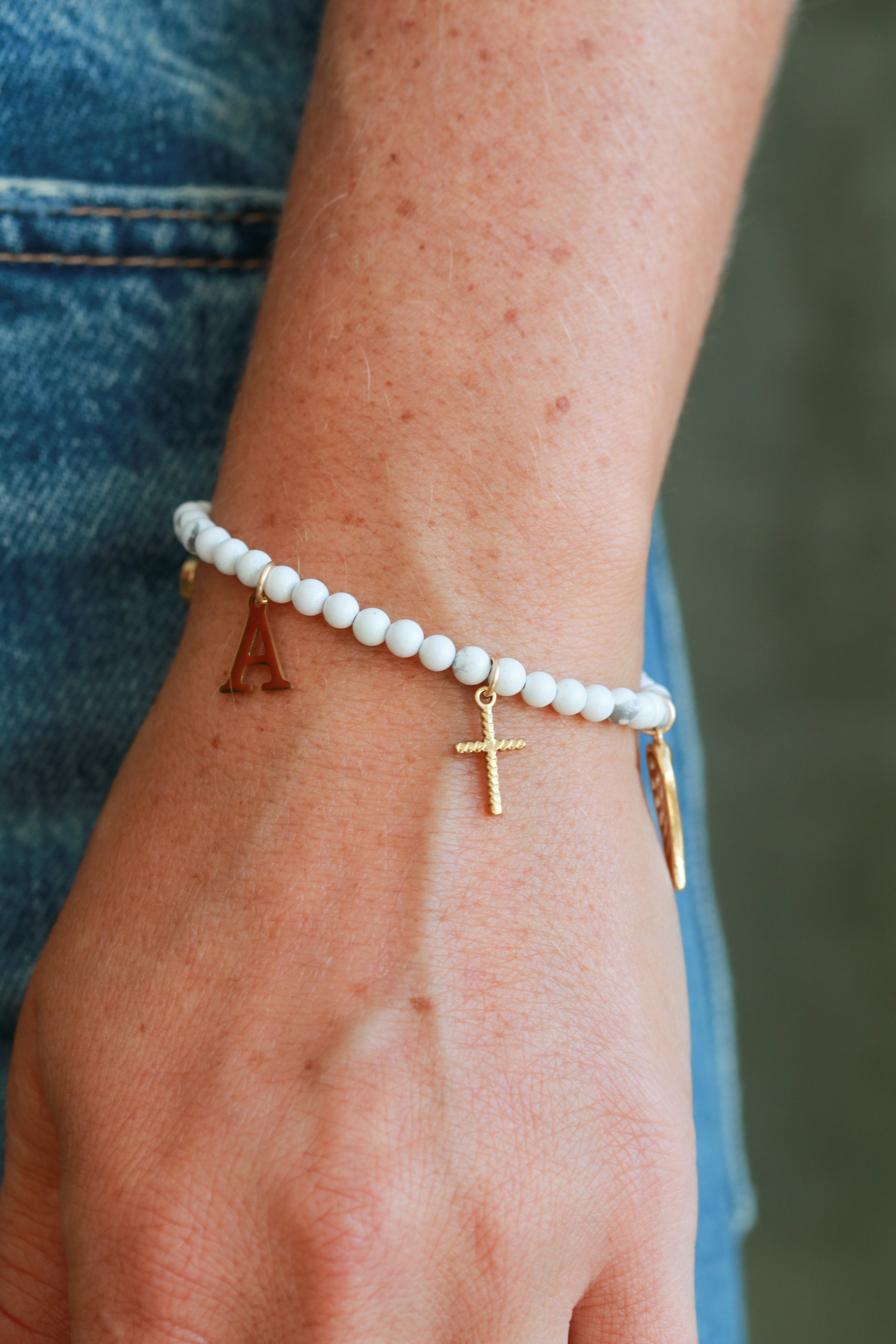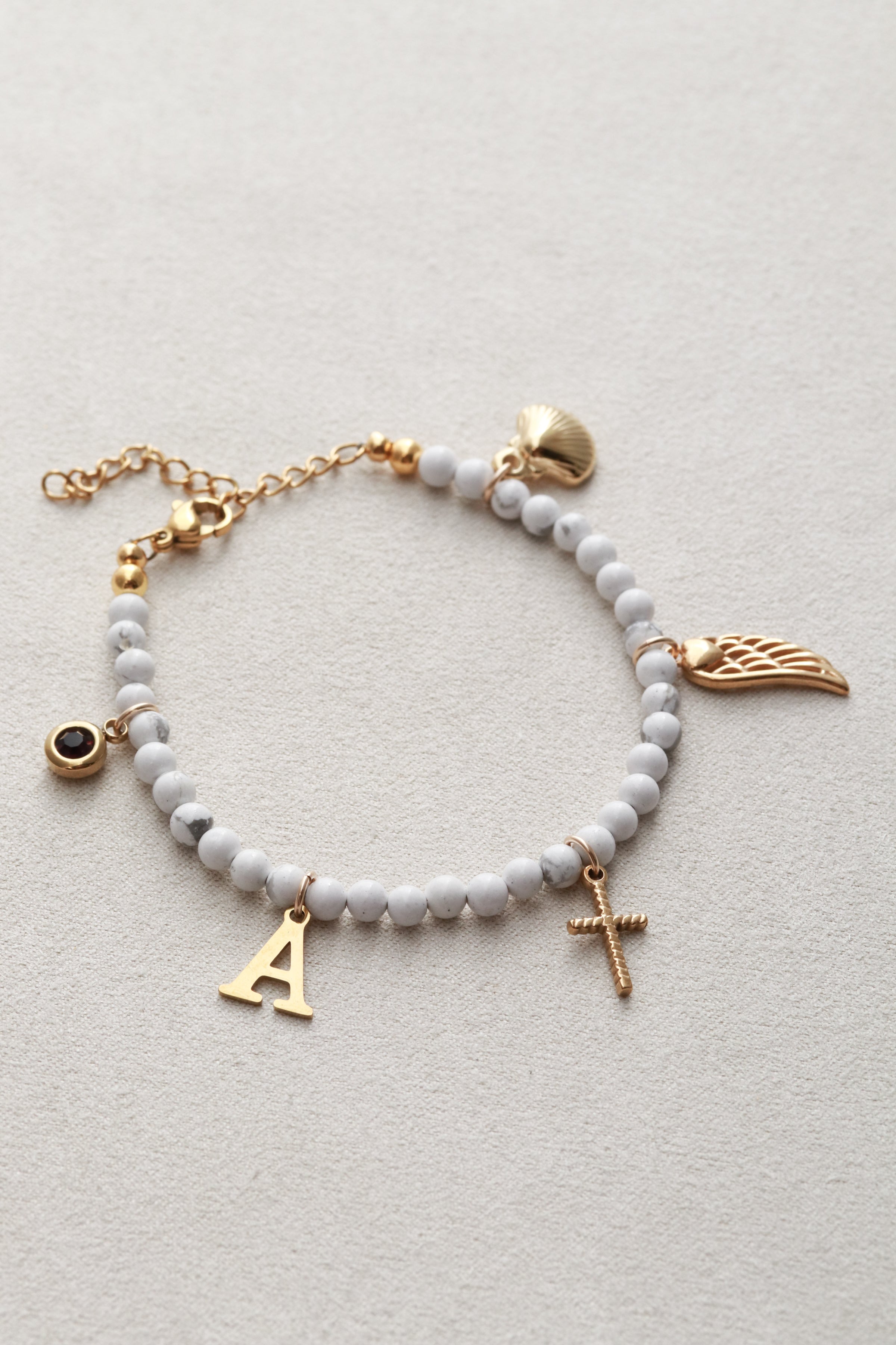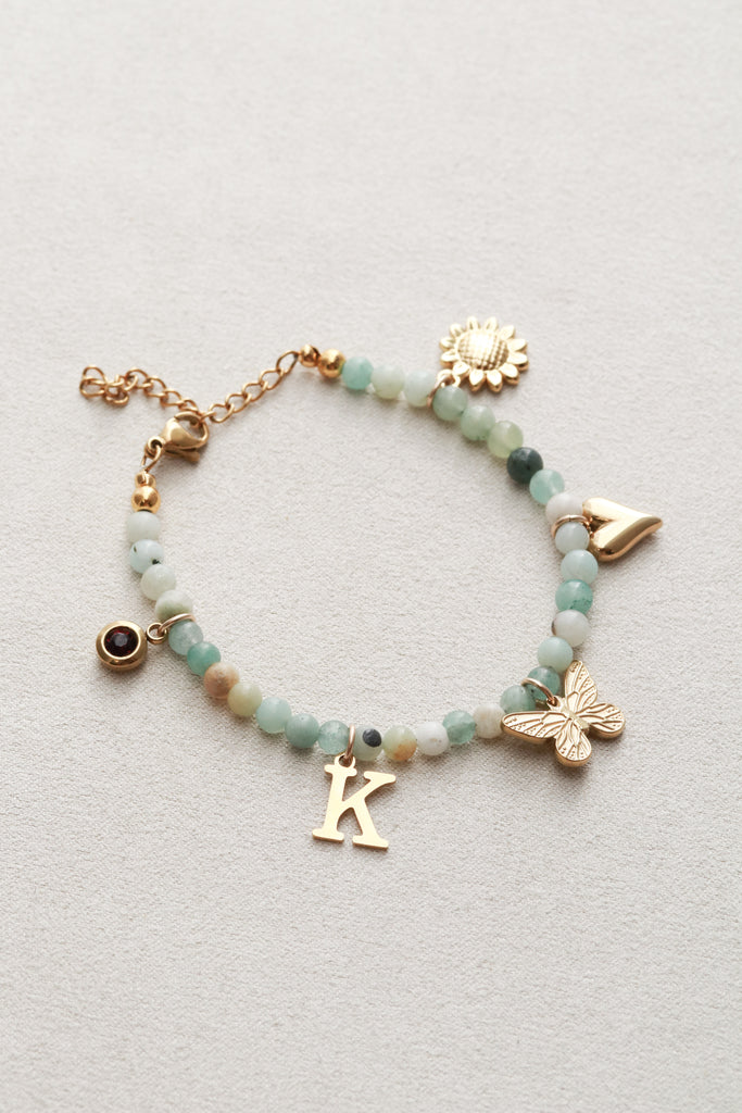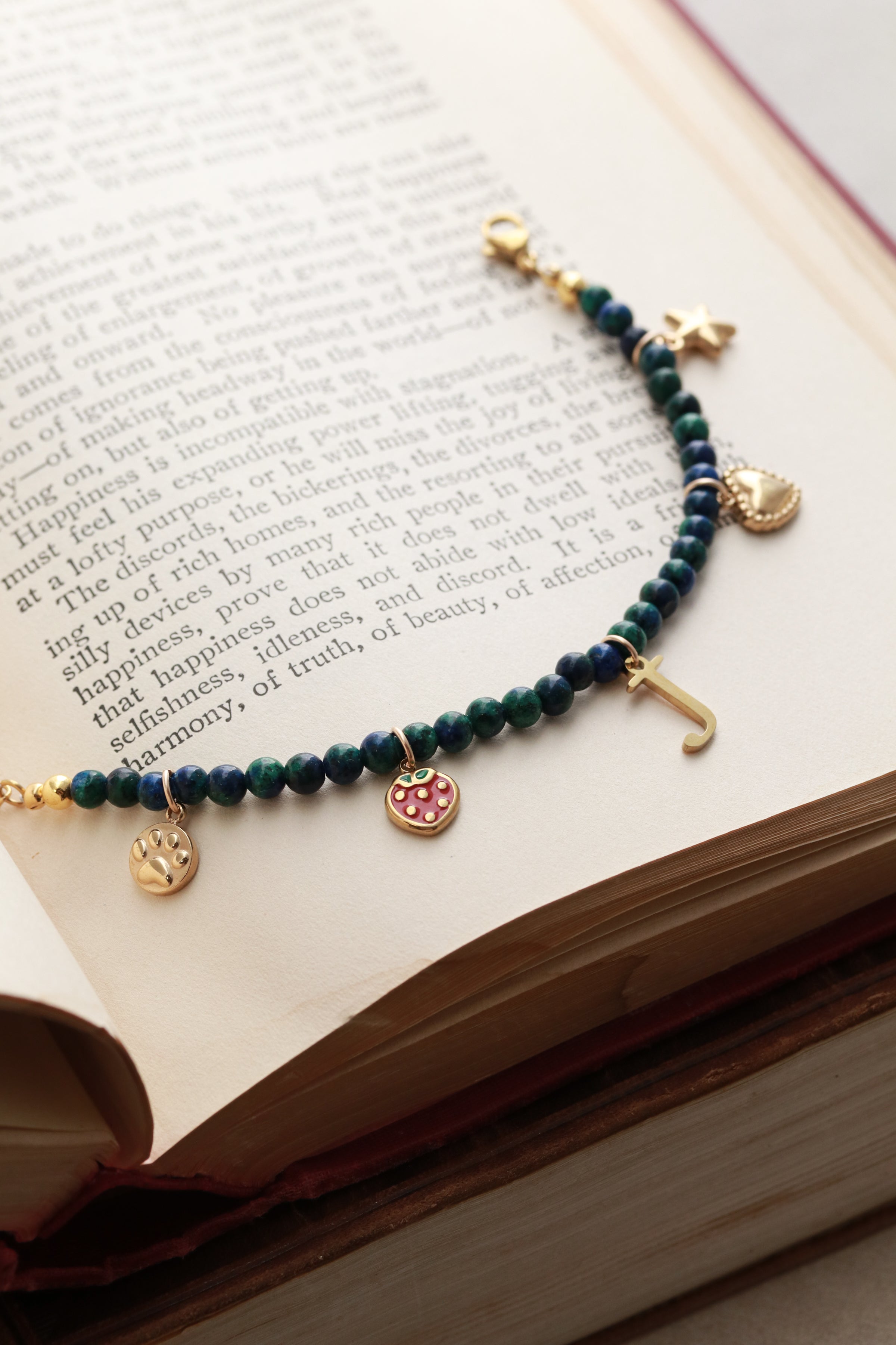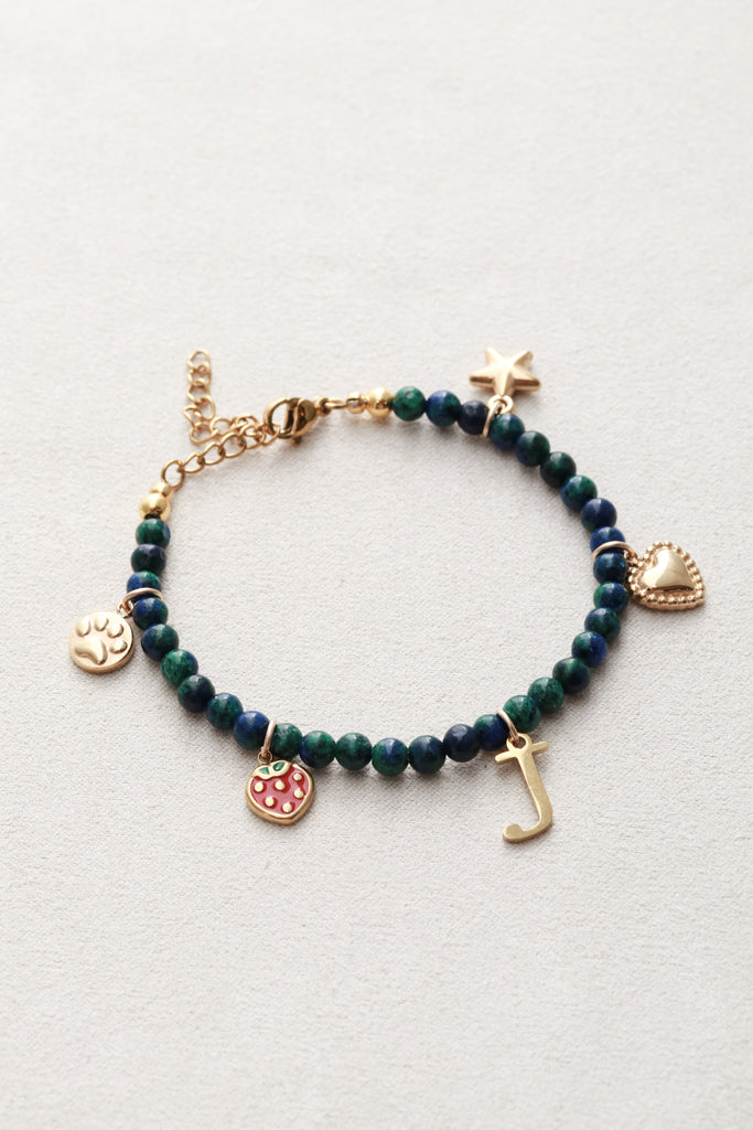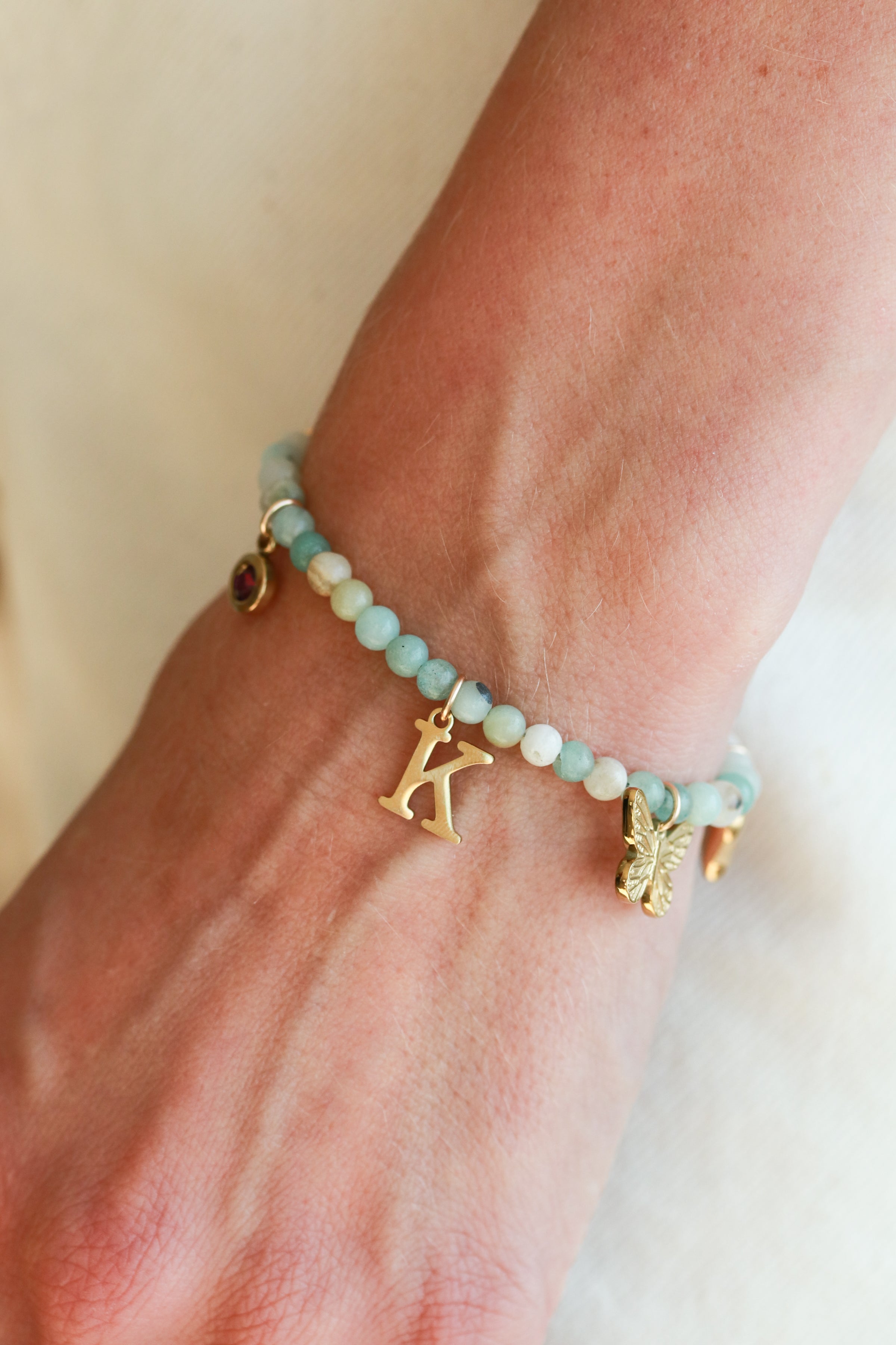 Create a bracelet that tells your story. Our custom Beaded Stone Charm Bracelet can be personalized with up to 6 gold charms to represent milestones, people, pets, places, talents, hobbies, and everything that makes you who you are. Choose from over 100 options including initials, hearts, stars, hobbies, travel icons, birthstones, and more.