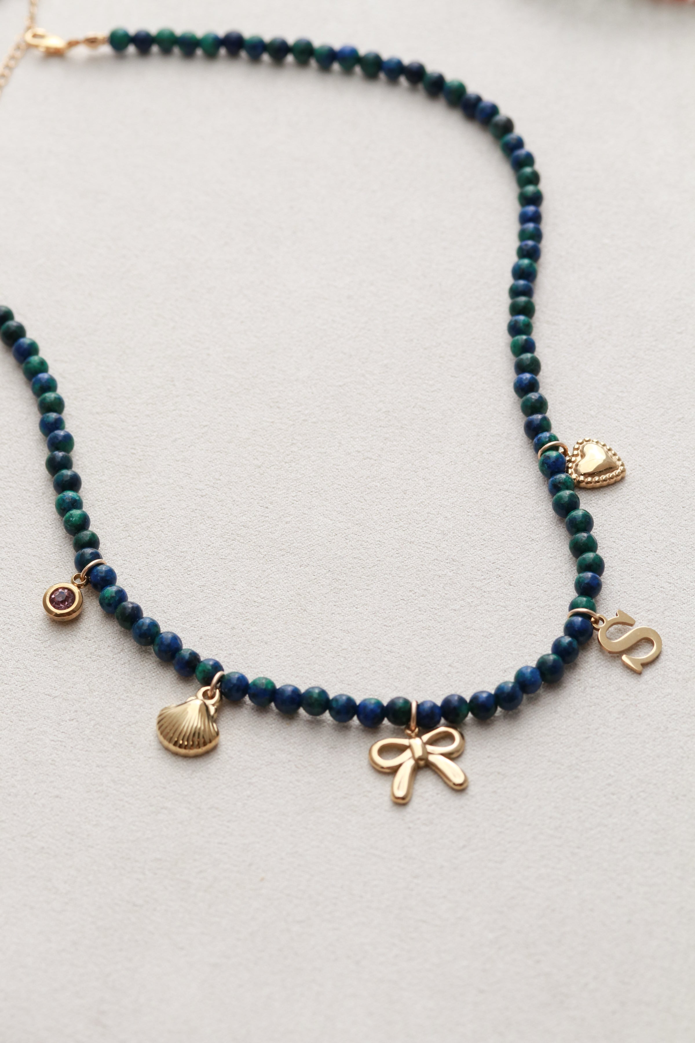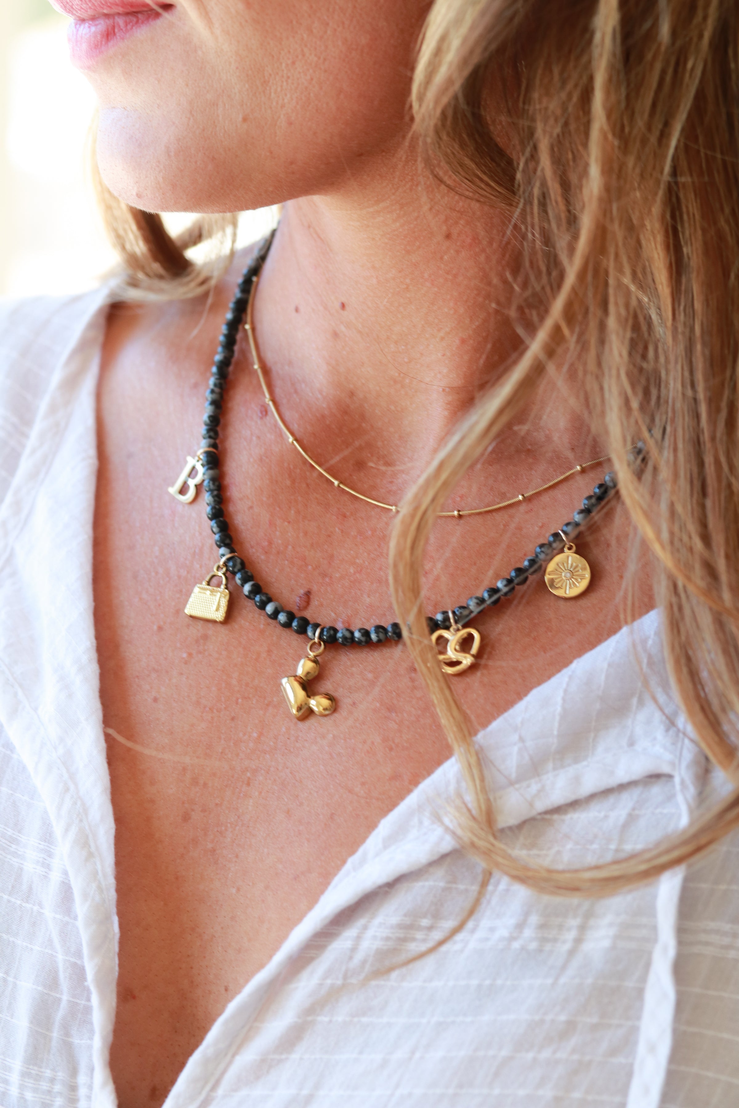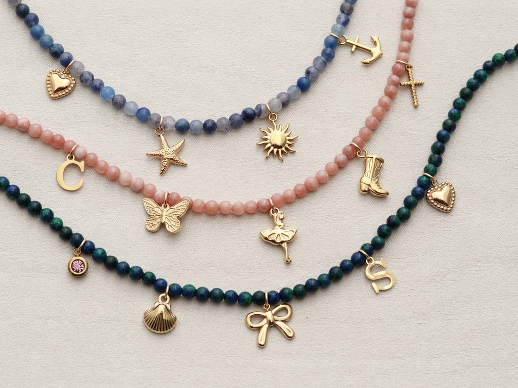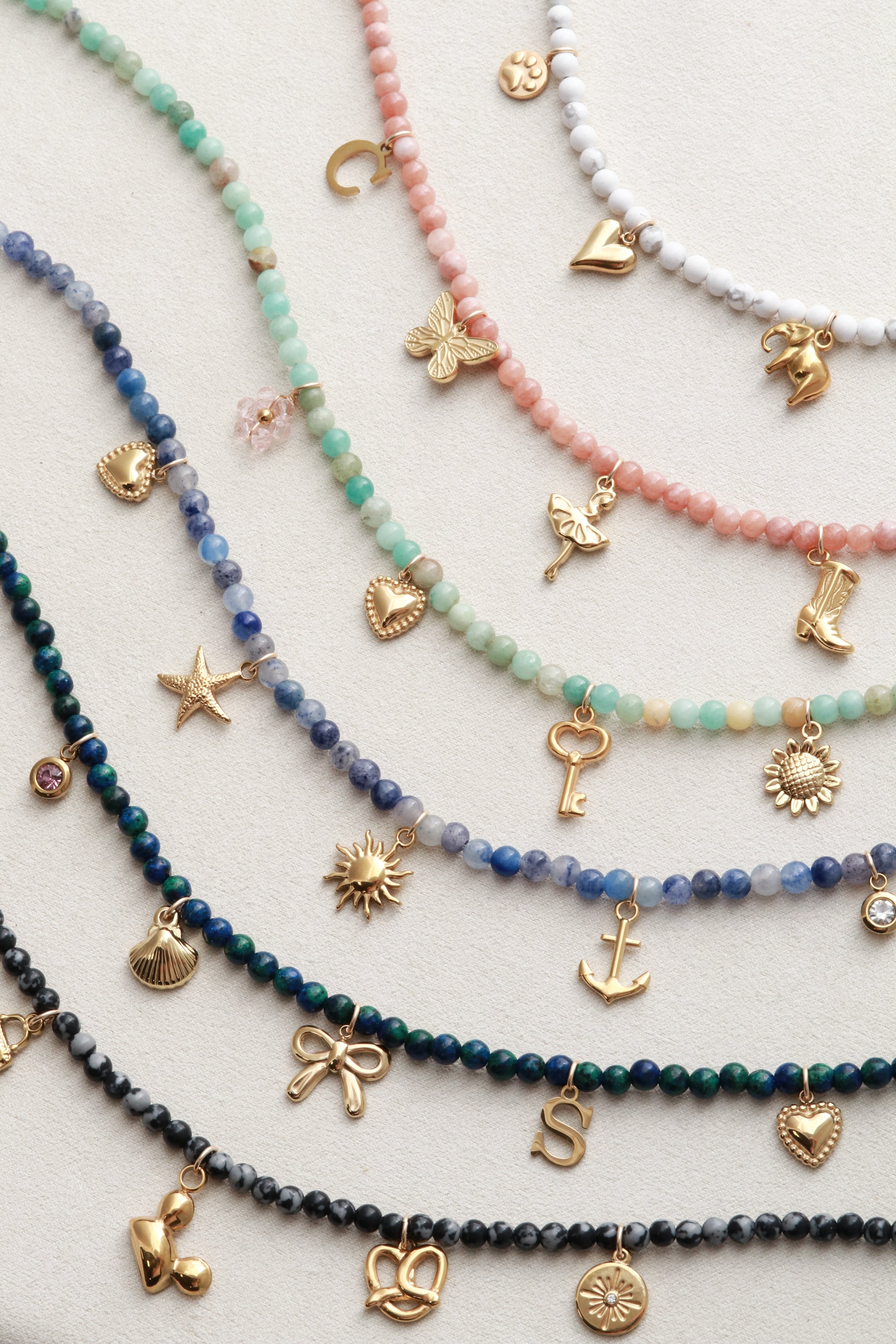 Create a necklace that tells your story. Our Beaded Stone Charm Necklace can be personalized with up to 8 gold charms - representing the moments, memories, and people that matter most. Choose from over 100 options including initials, hearts, stars, hobbies, travel icons, birthstones, and more.