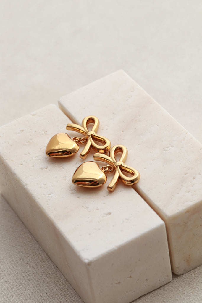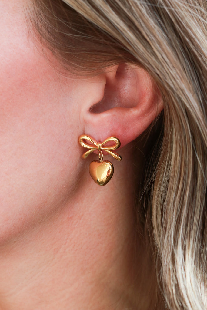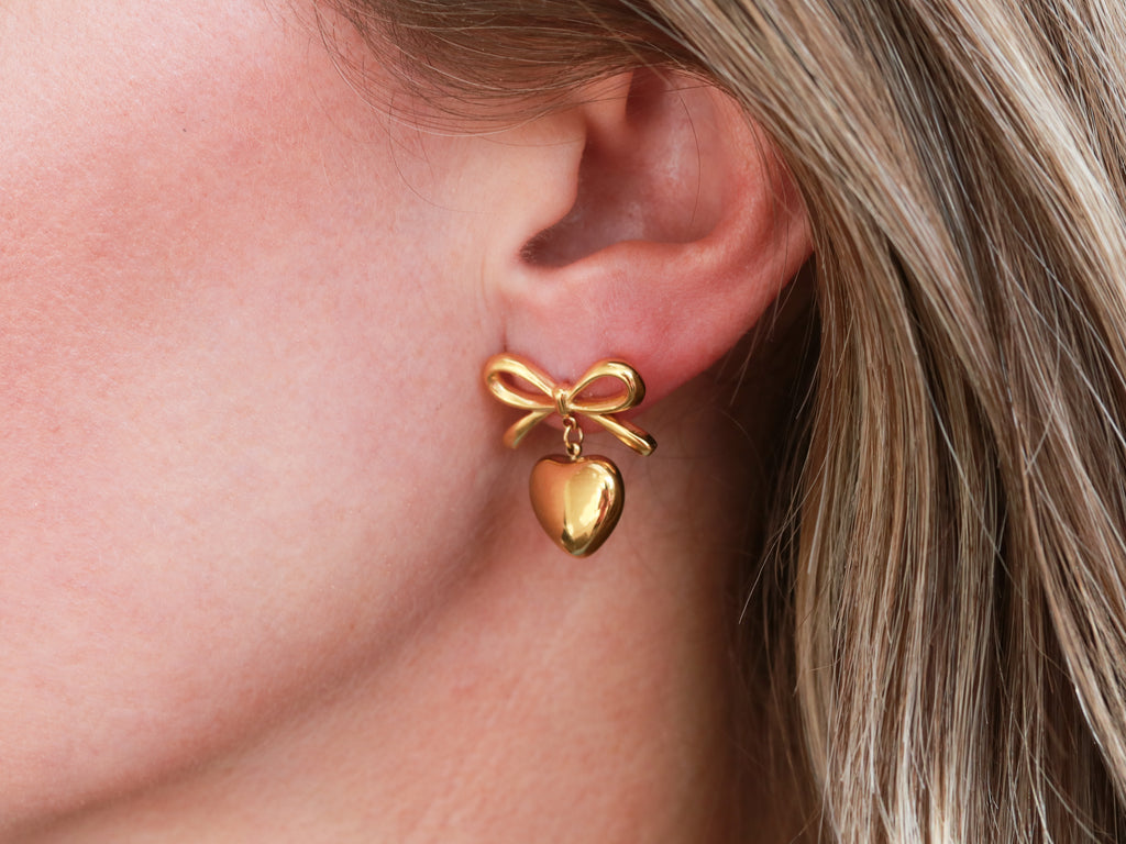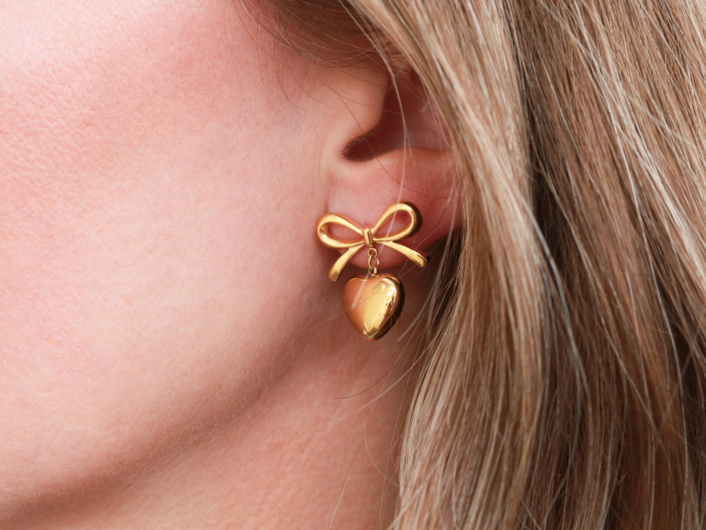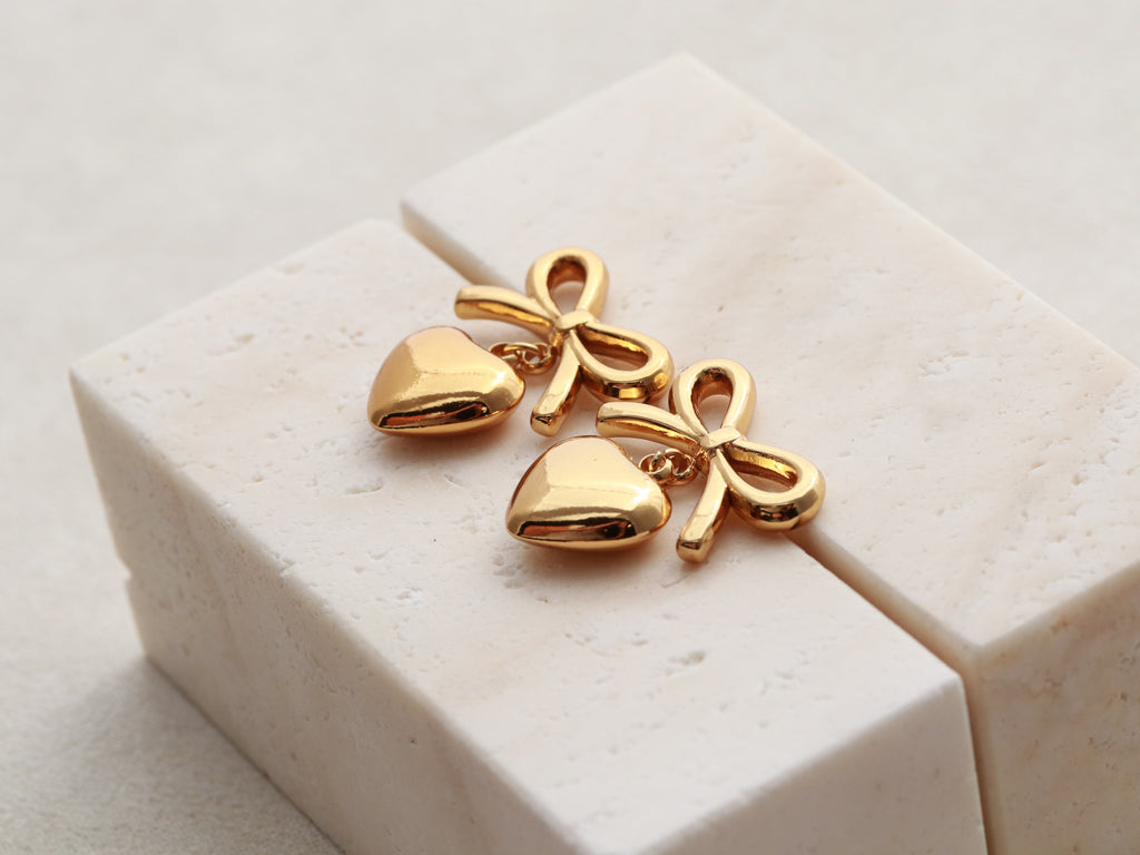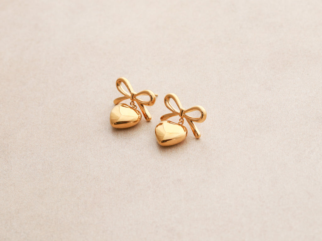 Playful and romantic. Our gold bow earrings feature a statement heart drop that moves with every step. Perfect for dressing up your everyday look or adding a sweet touch to special occasions.