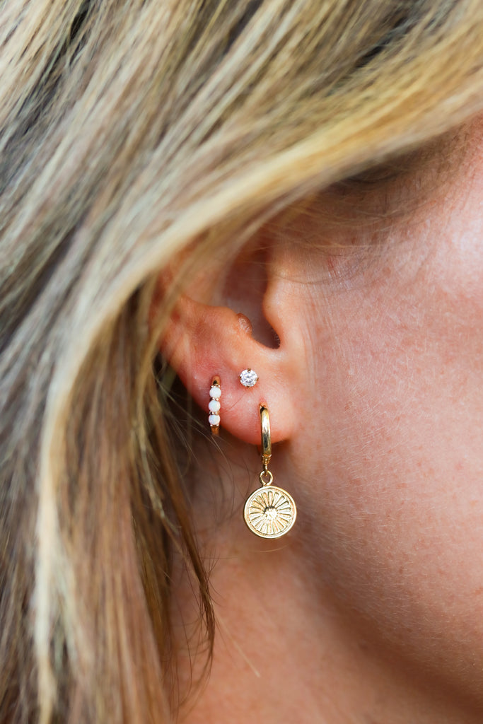 A little sunshine for your everyday. These radiant huggies feature a polished sunburst charm on a sleek, comfortable hoop, a symbol of warmth, energy, and confidence. Perfect for wearing solo or pairing with other favorites in your ear stack.